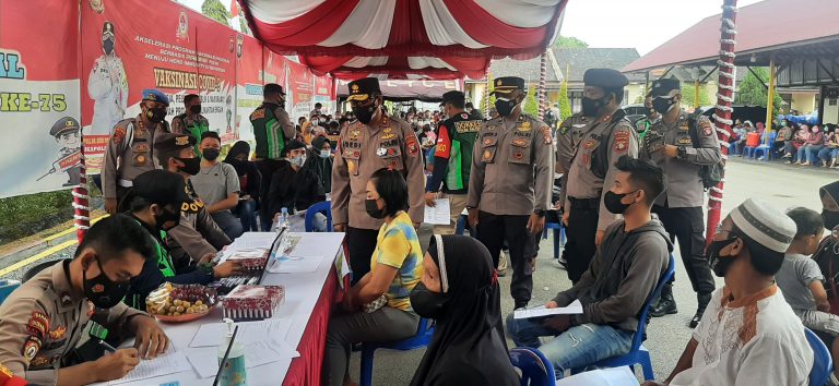 Tribratanews.polri.go.id – Palangka Raya. Kepala Rumah Sakit (Karumkit) Bhayangkara Palangka Raya Kompol dr. Anton Sudarto dampingi Kapolda Kalteng Irjen Pol. Dr. Dedi Prasetyo, M.Hum., M.Si., M.M., beserta pejabat utama Polda Kalteng tinjau pelaksanaan Vaksinasi Massal dan Bakti Sosial di Mako Ditsamapta Polda Kalteng Jalan Tjilik Riwut Km. 6,5 Kota Palangka Raya, Selasa (22/6/2021) pagi.